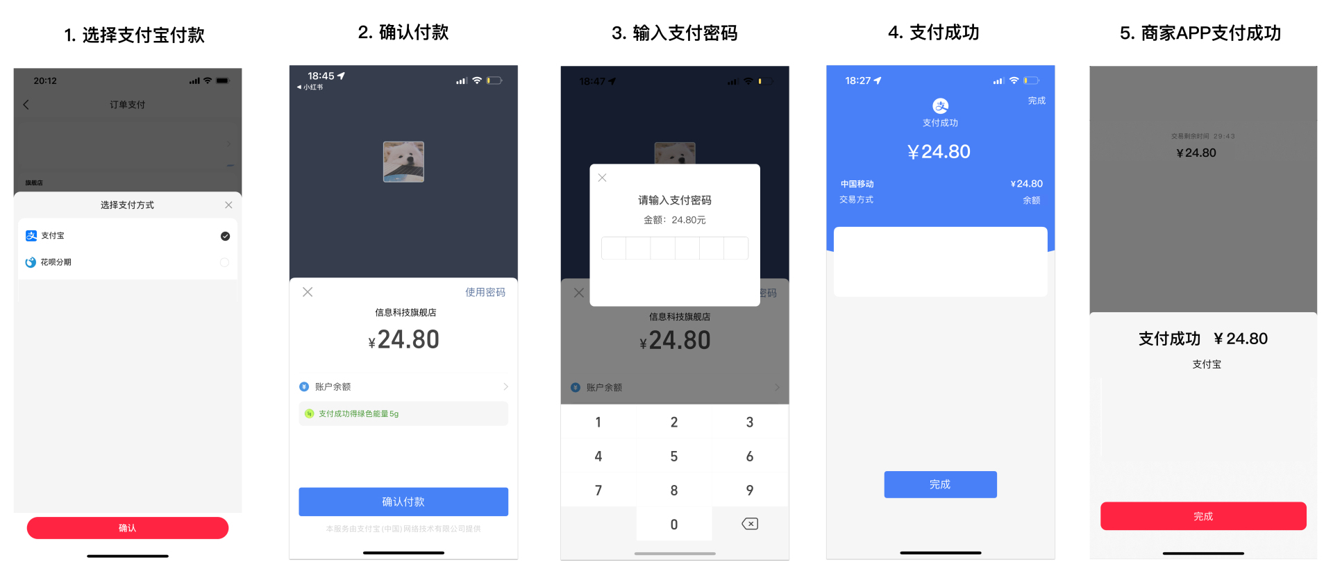 商户调用此接口,服务端返回支付参数,据返回的参数唤醒支付宝客户端,消费者完成支付。